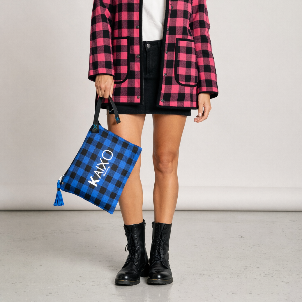 El bolso kaixo: Es nuestro bolso de mano multiusos de tejido a cuadros en tres colores: azul, verde y rosa. Cierre de cremallera metálica gruesa en la parte superior y asa de mano con detalle de arandela en color plata de donde cuelga el asa. Un bolso muy versátil.