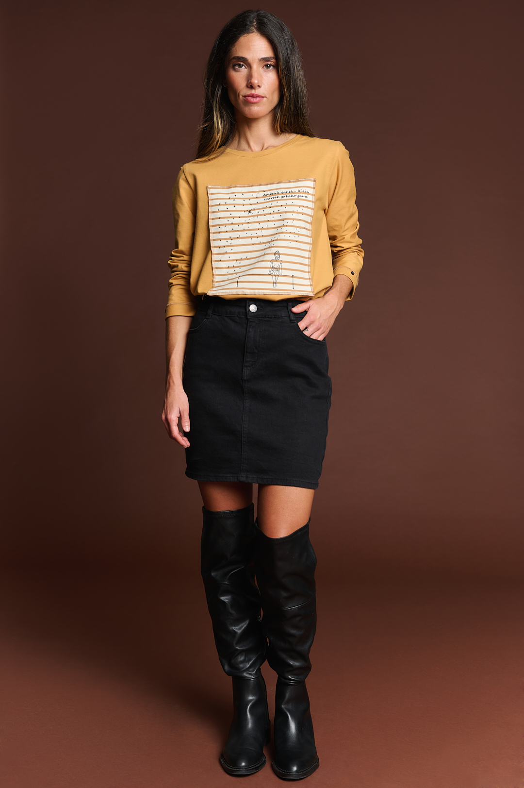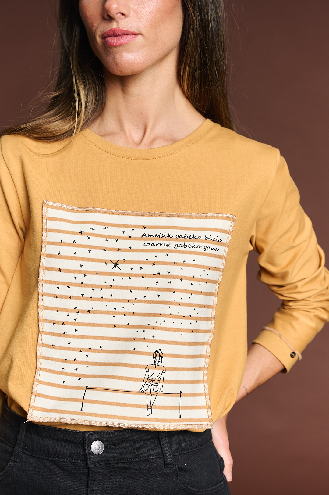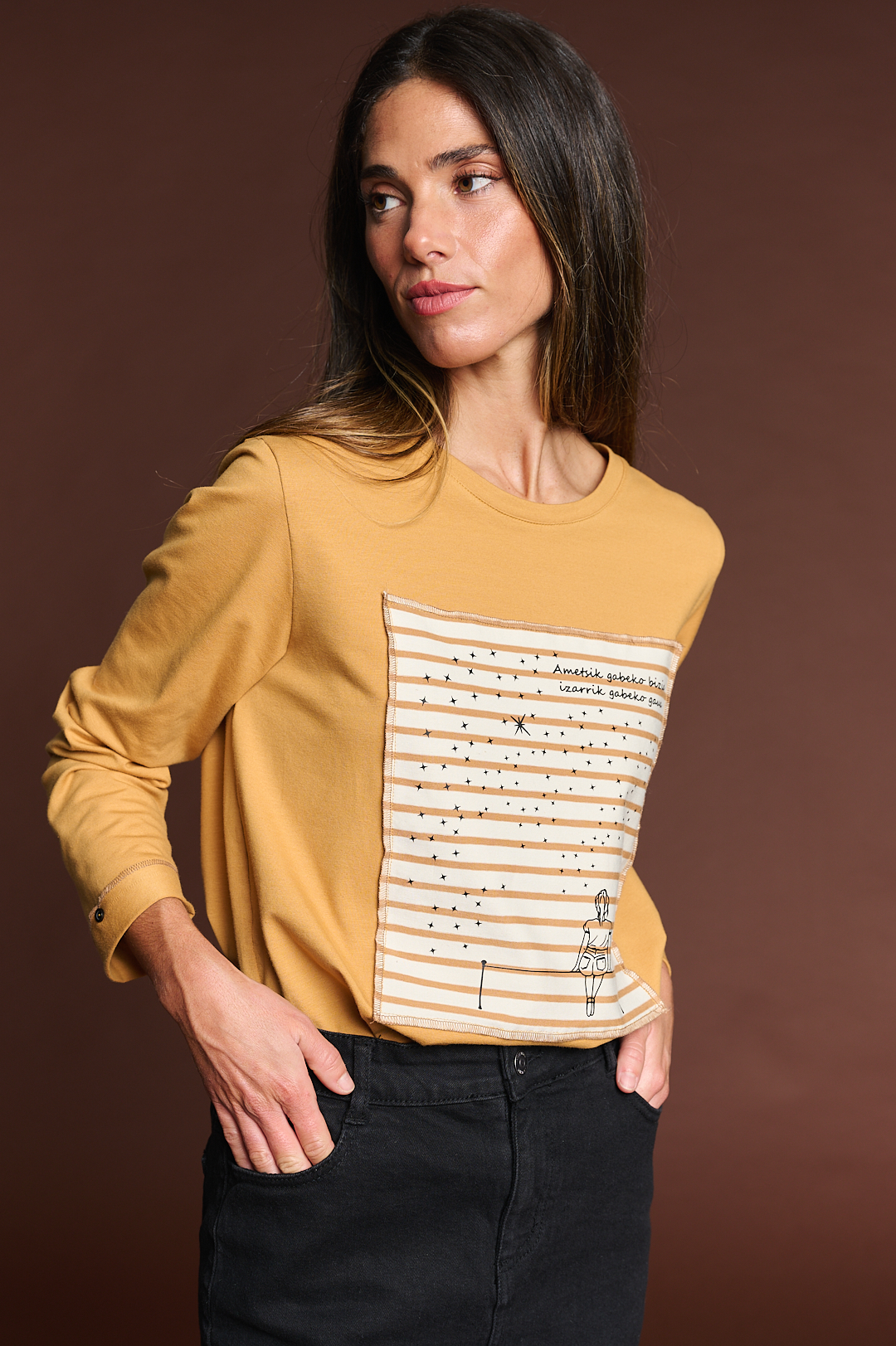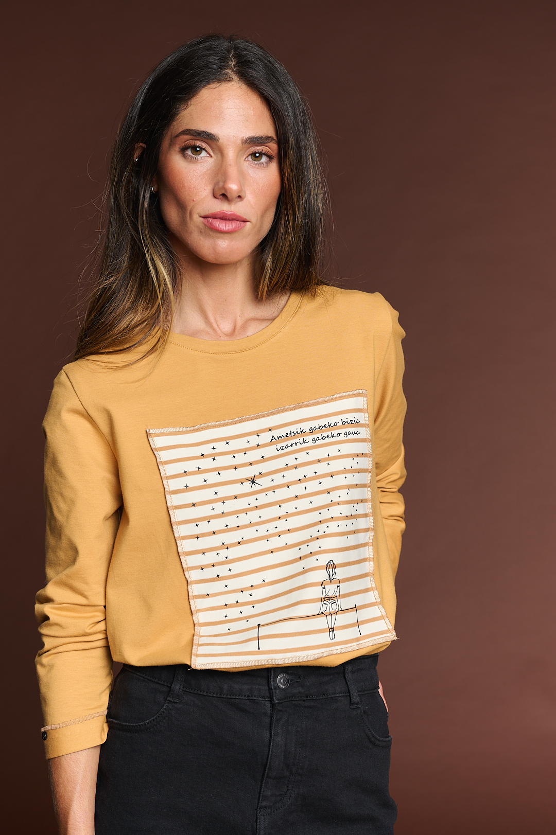 Camiseta Ametsik: La camiseta ametsik de escote redondo, manga larga y pegada. Confeccionada en mezcla de algodón y poliéster. Aplique frontal de tejido a rayas en blanco roto y camel y una delicada serigrafia en negro. La base de la camiseta es un tejido liso en color ocre.. Una prenda de tacto dulce y muy agradable sobre la piel, El básico perfecto para dar luz a tus look diarios de esta temporada.