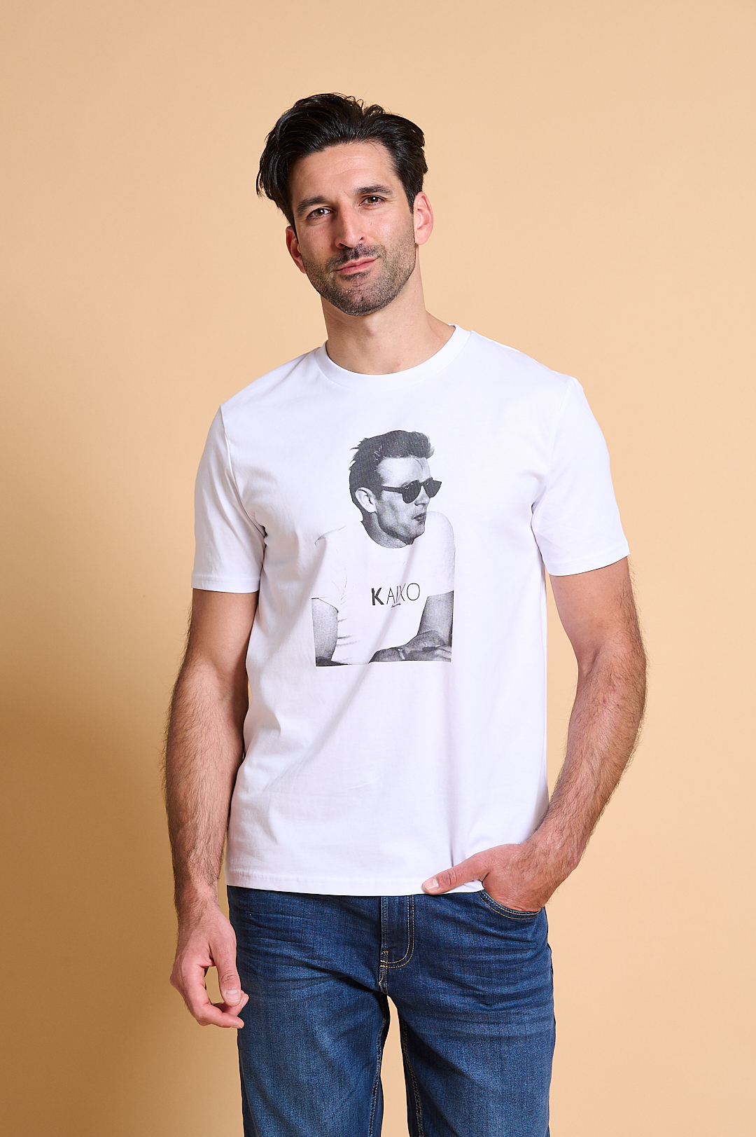 Camiseta Kaixo James: Camiseta blanca de corte recto y tacto suave. De manga corta y cuello redondo. lleva serigrafiado la imagen de James Dean en el frontal. Esta confeccionada en algodón 100% orgánico. Una camiseta para aquellos chicos que buscan la comodidad en su día a día.