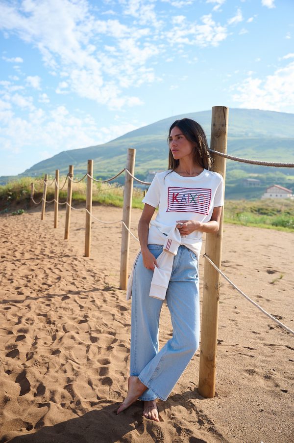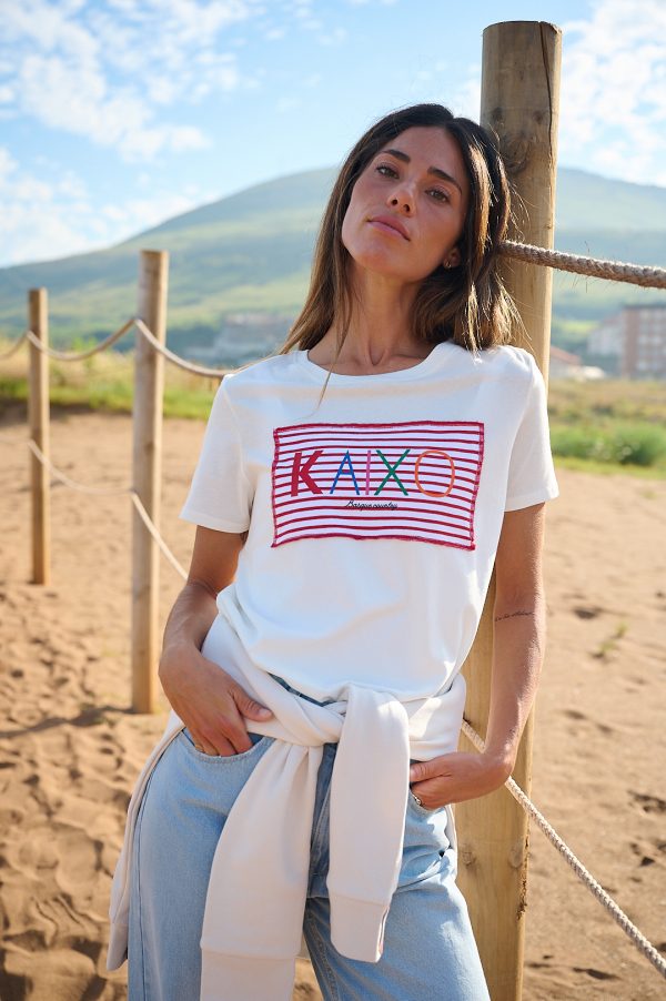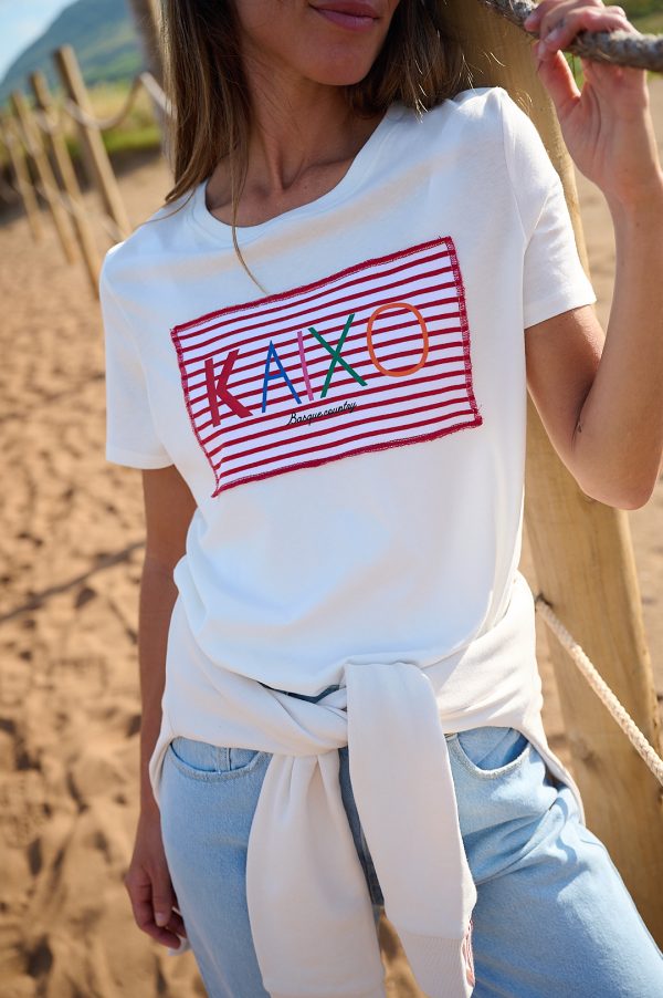 Camiseta Marinela berria, de algodón, manga corta y escote redondo. Camiseta crema de tacto muy suave. Lleva como detalle en la parte frontal la pieza de tejido a rayas en rojo y crema y superpuesto el logo de colores en vinilo.Una camiseta muy cómoda y fresca ideal para este verano.