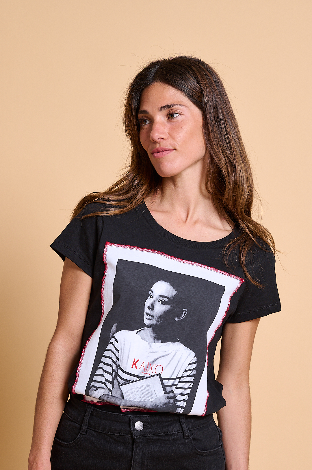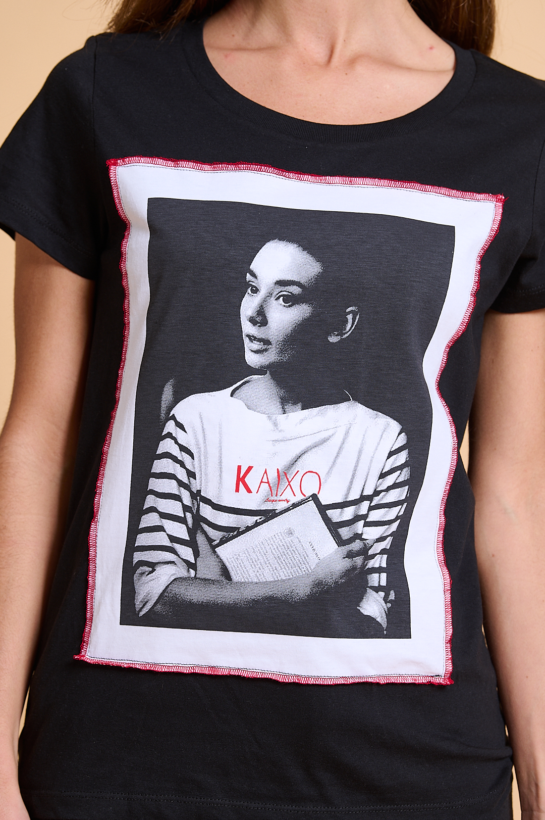 Camiseta kaixo Audrey: Original camiseta de mujer, de manga corta pegada y escote redondo. Su silueta es de corte normal y la composición es 100% algodón en color negro con algún detalle en rojo, lleva impreso en el frontal la imagen de la actriz AUDREY HEPBURN.