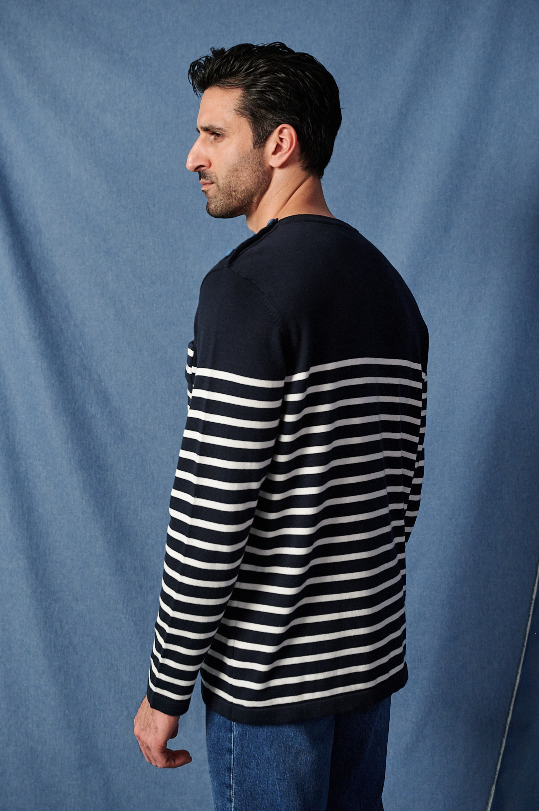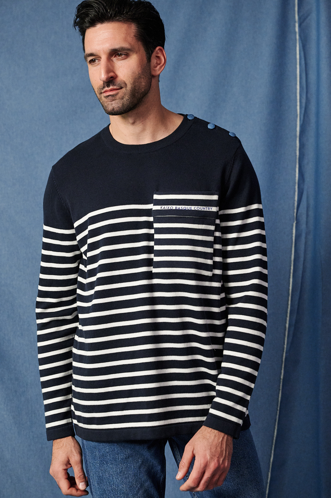 Jersey marínela de rayas en azul marino y blanco. 100% algodón. Lleva el detalle de los botones forrados en tejido denim en uno de los hombros y un bolsillo plastón con el logo impreso en tonos azules.. El cuello es redondo y acabado de canalé, así como el bajo y los puños. Un jersey atemporal, que nunca pasa de moda.