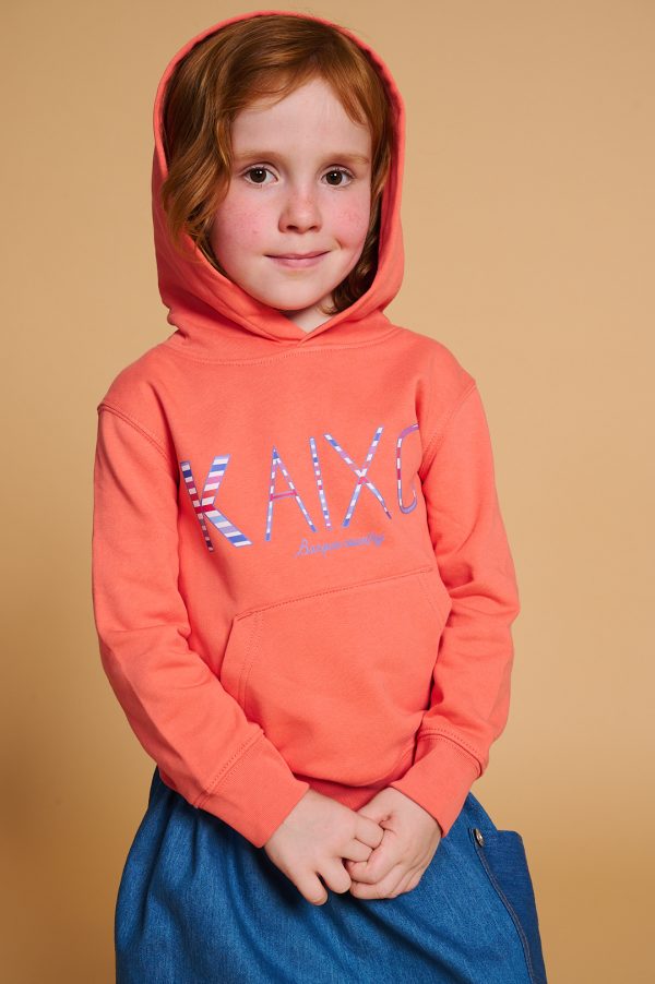 Sudadera Kolore: Sudadera unisex con capucha forrada, manga larga y bolsillo canguro. El tejido es de felpa perchado. lleva el logo de Kaixo estampado a rayas de colores.