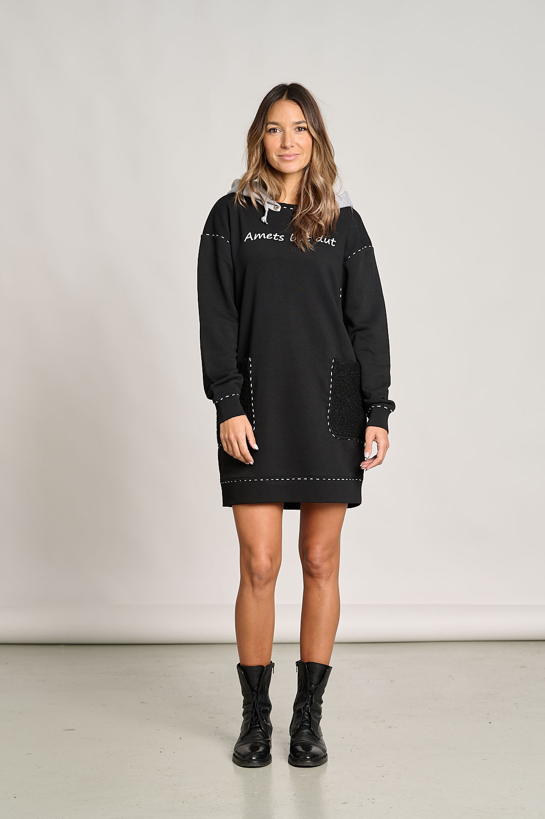 Vestido Sudadera: Vestido Sudadera con choto, escote redondo y hombro caído. Su tejido es de felpa no perchada. Vestido de línea amplia con bolsillos plastón confeccionados en tejido de lana rizada. El detalle de la frase serigrafiada en color gris al tono del choto y del pespunte de adorno que recorre todas las costuras del vestido. Una prenda muy favorecedor, actual y que no dejará a nadie indiferente
